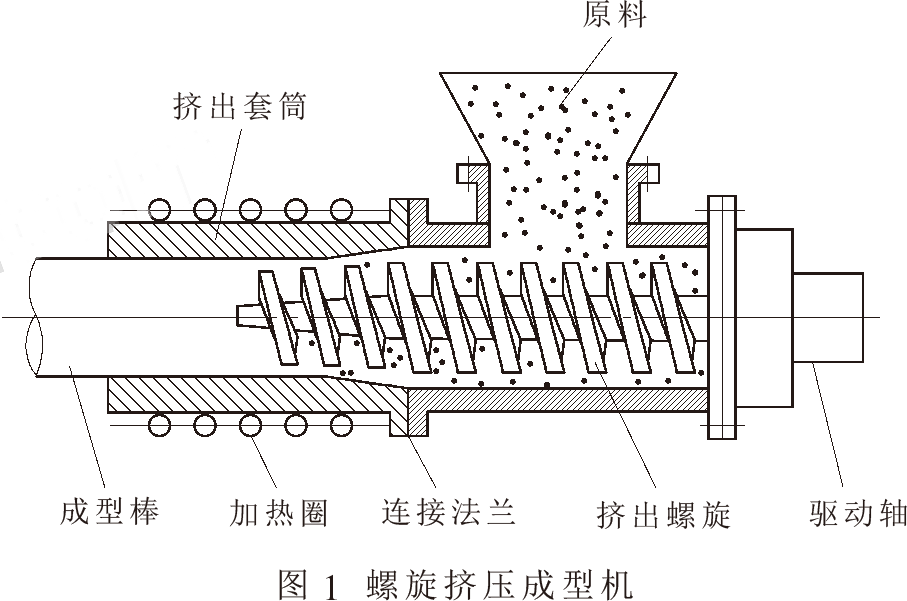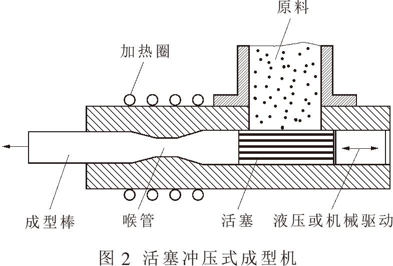 螺旋擠壓成型技術(shù)有很多優(yōu)點(diǎn),比如成品密度高,成型棒料的密度都在1100~1400kg/m3;生產(chǎn)連續(xù)性好;成品質(zhì)量好,熱值高,適合于加工成炭化材料。然而其缺點(diǎn)也是較為明顯的,比如產(chǎn)量低、能耗高、螺旋桿易磨損等,原料要求苛刻。螺旋擠壓成型機(jī)成型溫度一般在220~280℃,為了避免成型過程中原料水分快速汽化造成型塊開裂,一般將原料的含水率控制在8%~12%,所以要對(duì)物料進(jìn)行干燥處理,從而增加了成本。這一點(diǎn)也限制了螺旋擠壓成型技術(shù)的發(fā)展。 3.2.2活塞沖壓技術(shù) 活塞沖壓式成型機(jī)主要由加熱圈、活塞和成型喉管組成,其活塞可由機(jī)械或液壓驅(qū)動(dòng),如圖2所示。被粉碎的生物質(zhì)原料中的木質(zhì)素由在驅(qū)動(dòng)力作用下往復(fù)運(yùn)動(dòng)的活塞推入加熱圈內(nèi),在加熱圈的作用下軟化,并在喉管處擠壓成型,之后壓力釋放形成棒狀排出。