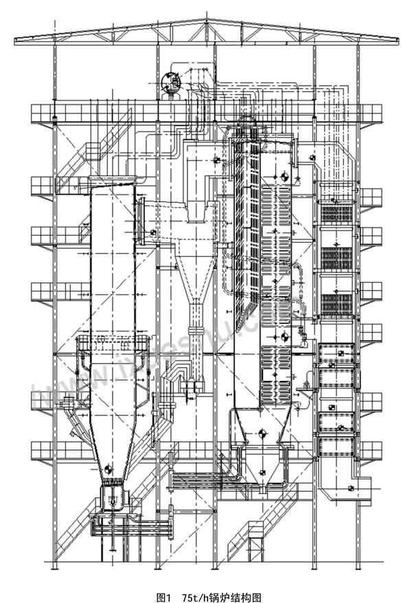 [摘要]生物質(zhì)燃料用于鍋爐,既可解決能源短缺問題,又可減輕環(huán)境污染。通過對生物質(zhì)和酒糟燃燒機理的研究,開發(fā)了生物質(zhì)燃料鍋爐。文章闡述了該類型鍋爐的設計特點及運行情況。 隨著我國現(xiàn)代化進程的快速發(fā)展,煤炭、石油等一次能源被大量消耗,能源短缺問題日益嚴重。尋求新的可再生能源代替煤炭、石油等一次能源,成為一項重要任務。生物質(zhì)能源以農(nóng)林等有機廢棄物和土地種植物為原料、以農(nóng)作物淀粉油脂作為調(diào)劑生產(chǎn)的清潔能源及相關(guān)化工產(chǎn)品,系環(huán)境友好型可再生能源,如多種燃料乙醇、生物柴油和沼氣等。相比其它可再生能源,生物質(zhì)能源具有多項優(yōu)勢。生物質(zhì)能源使用秸稈、稻殼等廢棄物,這些廢棄物即便不用,在腐化過程中同樣會釋放溫室氣體。若采用生物質(zhì)作為燃料,則可實現(xiàn)真正意義的零排放。因此,生物質(zhì)能源具有明顯的優(yōu)勢。 鍋爐是一種能源消耗產(chǎn)品。提高鍋爐的效率,使之節(jié)能是今后發(fā)展的重要方向。面對著能源短缺問題,按照國家節(jié)能環(huán)保的要求,發(fā)展生物質(zhì)燃料鍋爐具有巨大的潛力[1]。 1生物質(zhì)能源的燃燒機理 生物質(zhì)能源作為鍋爐的燃料,與常規(guī)燃料(煤炭)相比,具有以下幾個明顯特點:(1)發(fā)熱值低,水分含量大,且隨季節(jié)變化較大;(2)玉米秸稈灰中SiO2含量高,存在著床料易結(jié)團、尾部對流受熱面磨損嚴重的問題;(3)揮發(fā)分高、含氧量高、灰量偏少、燃料及灰密度低。具有易著火(300℃左右)、燃盡率低、CO排放量較大;(4)灰熔點低,易粘結(jié);(5)秸稈灰中Na、K、Cl離子含量高,容易出現(xiàn)高低溫腐蝕;(6)密度小,質(zhì)量輕,易懸浮[2]。 2生物質(zhì)燃料鍋爐的設計特點 2.1燃料特性 以設計生產(chǎn)的75t/h中溫中壓循環(huán)流化床生物質(zhì)燃料鍋爐為例。此型鍋爐的燃料主要為稻殼和秸桿,為保證鍋爐具有良好的適用性,鍋爐按玉米稈的成分設計,鍋爐考核試驗時,按相關(guān)國家標準進行折算。設計的燃料成分見表1。