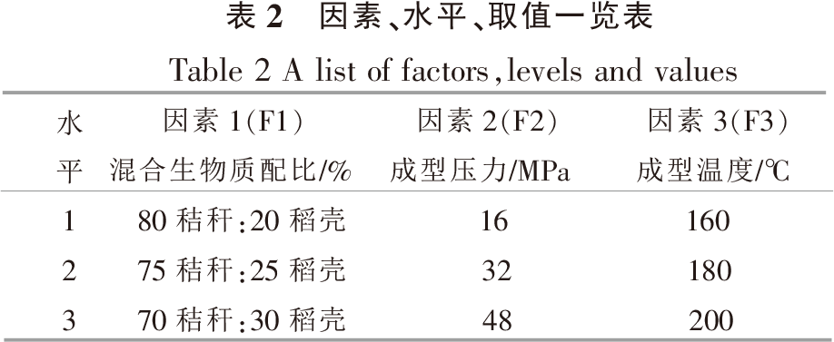 本試驗(yàn)取玉米秸稈與稻殼粉組合、成型溫度,成型壓力3個(gè)因素;每個(gè)因素取3水平,取值見表2。分析認(rèn)為,玉米秸稈和木屑的熱值都比較高,軟化溫度較低,且數(shù)值比較接近,木屑的灰分少,配比中木屑用量多,成本增加較大;水稻稻殼熱值相對(duì)較低,軟化溫度很高,不易結(jié)渣,水稻稻殼和玉米秸稈在熱值和灰熔融性方面具有互補(bǔ)性。
