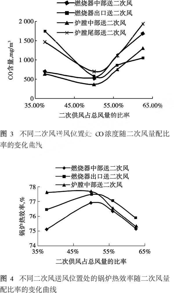 實(shí)驗(yàn)結(jié)果表明:當(dāng)二次風(fēng)量供給小于50%時(shí),爐膛內(nèi)供應(yīng)的氧不足,出現(xiàn)一定的不完全燃燒,當(dāng)二次風(fēng)量供給大于50%時(shí),由于冷空氣過大將可燃?xì)怏w吹散,使?fàn)t膛溫度降低,一些可燃物質(zhì)來不及燃燒就被帶到排煙管道,排煙溫度增高,熱損失增大。因此,當(dāng)一、二次風(fēng)量配比為50%時(shí)為最佳。 (3)在試驗(yàn)不同的二次送風(fēng)的配比率的同時(shí),改變二次送風(fēng)位置,記錄二次送風(fēng)的位置和配比率對(duì)鍋爐排煙中CO濃度及鍋爐的熱效率的試驗(yàn)結(jié)果如下。