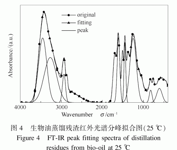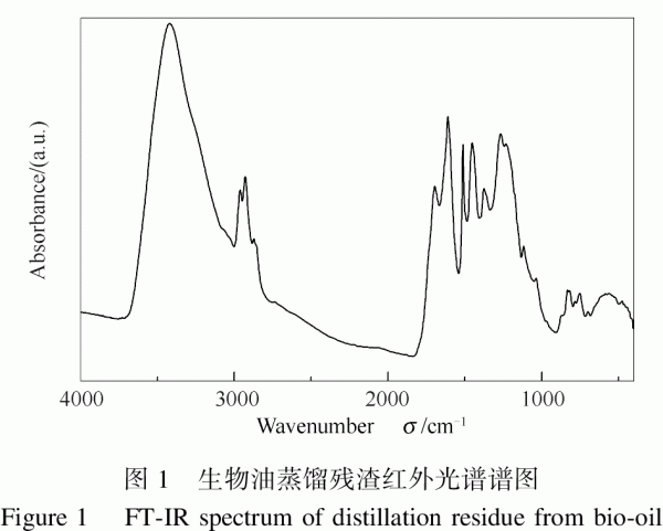 1.2實(shí)驗(yàn)儀器和條件 采用TGAQ500熱分析儀對(duì)生物油蒸餾殘?jiān)臒崾е靥匦赃M(jìn)行實(shí)驗(yàn)研究,實(shí)驗(yàn)升溫范圍為室溫至750℃,載氣選取氮?dú)猓瑲怏w流量為100mL/min,升溫速率分別為10℃/min。紅外光譜采用Nicolet8700傅里葉變換紅外光譜儀,4cm-1分辨率,掃描32次,波數(shù)4000-400cm-1,選用樣品與溴化鉀的比例為1頤180,采用溴化鉀壓片法制樣,存于干燥器中待用。拉曼光譜采用激光共焦顯微拉曼光譜儀LABRAM-HR,光譜分辨率:0.6cm-1,掃描400-3300cm-1,波數(shù)精度±1cm-1,掃描重復(fù)性:±0.2cm-1。 2結(jié)果與討論 2.1生物油蒸餾殘?jiān)t外光譜分析 生物油蒸餾殘?jiān)t外光譜譜圖見(jiàn)圖1。