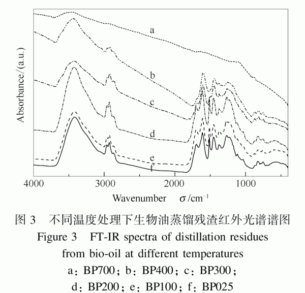 由圖2可知,生物油蒸餾殘?jiān)诘獨(dú)夥諊碌臒崾е剡^(guò)程主要為三個(gè)階段:第一階段的溫度為室溫至145℃,DTG曲線(xiàn)出現(xiàn)一個(gè)次失重峰,峰值對(duì)應(yīng)溫度為105℃,結(jié)合生物質(zhì)蒸餾殘?jiān)胤治龊凸I(yè)分析可以判斷出是該階段為水分析出;第二階段的溫度為145-550℃,期間出現(xiàn)一個(gè)明顯的失重峰,該段的主要反應(yīng)為大分子物質(zhì)發(fā)生裂解,通過(guò)失重曲線(xiàn)可以觀(guān)察到此階段失重達(dá)到60%,與揮發(fā)分比例接近;第三階段的溫度為550-750℃,質(zhì)量變化基本趨于穩(wěn)定,說(shuō)明熱解已經(jīng)接近完全,剩余殘余物為25%左右的熱解焦炭。 2.3生物油蒸餾殘?jiān)鼰峤饨固考t外光譜分析 圖3為生物油蒸餾殘?jiān)约霸诓煌瑴囟认聼崽幚懋a(chǎn)物紅外光譜譜圖。根據(jù)生物油蒸餾殘?jiān)鼰崾е厍€(xiàn),本研究選取了100、200、300、400和700℃為蒸餾殘?jiān)固款A(yù)處理溫度。