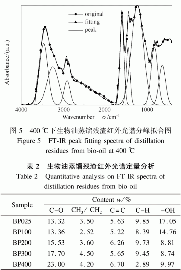 由圖3可知,-OH官能團(tuán)和脂肪族烴基官能團(tuán)隨著熱處理溫度的升高而逐漸減少,BP700的脂肪族官能團(tuán)的吸收峰已經(jīng)基本消失;BP025的特征峰最多,表明其所含的官能團(tuán)種類(lèi)最多,BP100、BP200、BP300和BP400特征峰的數(shù)量隨著熱處理溫度的升高而逐漸減少,表明所含官能團(tuán)逐漸減少。 相比于BP025,BP700的紅外光譜譜圖變化最為明顯,所有的官能團(tuán)區(qū)域都發(fā)生了較大幅度的變化,各官能團(tuán)的吸收峰基本消失,說(shuō)明在700℃下生物油蒸餾殘?jiān)呀?jīng)基本裂解完全。在熱處理溫度100和200℃時(shí),官能團(tuán)的吸收峰沒(méi)有明顯變化;但是在100℃時(shí),熱失重曲線(xiàn)上出現(xiàn)微小失重峰,這主要是因?yàn)橛形⒘康乃治龀?。?dāng)熱處理溫度為300℃時(shí),相較于BP025,BP300紅外光譜的吸收峰在1000-1200cm-1發(fā)生了明顯變化,吸收峰變成近似平滑的曲線(xiàn),這是由于糖類(lèi)的C-OH伸縮振動(dòng)峰已經(jīng)消失。同時(shí),可以觀(guān)察到BP200在1500cm-1附近存在明顯的吸收峰,而此時(shí)BP300只有微小的吸收峰,BP400則完全沒(méi)有,這是因?yàn)榇糃-OH面彎曲振動(dòng)吸收峰隨著熱處理溫度的升高逐漸消失。 在1660cm-1附近的脂類(lèi)中C=O伸縮振動(dòng)吸收峰隨著溫度的升高而逐漸消失,在200-400℃過(guò)程中變化最明顯。在2800-3000cm-1波段長(zhǎng)鏈烴基的甲基、亞甲基和次甲基的振動(dòng)伸縮吸收峰在隨著溫度的升高逐漸減弱,表明在此波段有攜帶這些基團(tuán)的物質(zhì)裂解揮出。 根據(jù)不同溫度處理下生物油蒸餾殘?jiān)t外光譜的變化情況,進(jìn)行分峰擬合處理[13],通過(guò)測(cè)量峰面積來(lái)定量分析生物油蒸餾殘?jiān)母鞴倌軋F(tuán)的變化情況[14,15]。不同溫度下的紅外光譜分峰擬合圖相似,選取BP025和BP400的紅外光譜譜圖,結(jié)果見(jiàn)圖4和圖5。