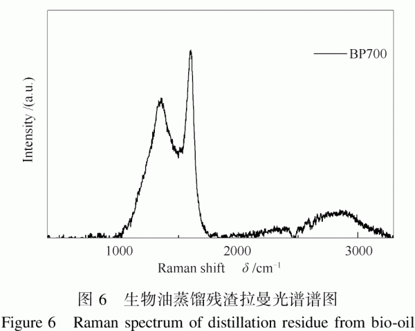 2.4生物油蒸餾殘?jiān)鼰峤饨固坷庾V分析 傅里葉變換拉曼光譜技術(shù)采用1064nm的近紅外激光照射樣品,明顯減弱了樣品發(fā)色基團(tuán)的熒光背景。除了低光譜背景干擾外,拉曼技術(shù)還具有高光譜分辨率、分析時(shí)間短、對(duì)樣品要求不高等優(yōu)點(diǎn)。700℃處理下的拉曼光譜見(jiàn)圖6。由圖6可以觀(guān)察到兩個(gè)吸收峰,1600cm-1附近的吸收峰稱(chēng)為G峰,是由碳環(huán)或是長(zhǎng)鏈中所有sp2拉伸形成的,其主要是苯環(huán)的對(duì)稱(chēng)伸縮振動(dòng)和與苯環(huán)共軛的C=C鍵的伸縮振動(dòng)[16]。1340cm-1附近的吸收峰稱(chēng)為D峰,是由材料的缺陷和無(wú)序誘導(dǎo)產(chǎn)生的[17]。隨著處理溫度的升高,D峰慢慢出現(xiàn)并且變得明顯,表明處理溫度的升高可以使材料缺陷明顯,D峰和G峰的共存表明該材料部分石墨化和不完美無(wú)定型同時(shí)存在。炭材料的石墨化程度用D峰和G峰的比值ID/IG來(lái)衡量[18-20],從低溫到高溫不同溫度下ID/IG±次為0.25、0.31、0.25、0.52、0.59和0.78。從以上數(shù)據(jù)中可以看出隨著處理溫度的升高,ID/IG值呈增大的趨勢(shì),表明材料石墨化程度增加、無(wú)序組分減少。材料的部分石墨化是成為較好電極材料的必要條件之一,是生物油蒸餾殘?jiān)倪M(jìn)一步高效利用的有效途徑之一。